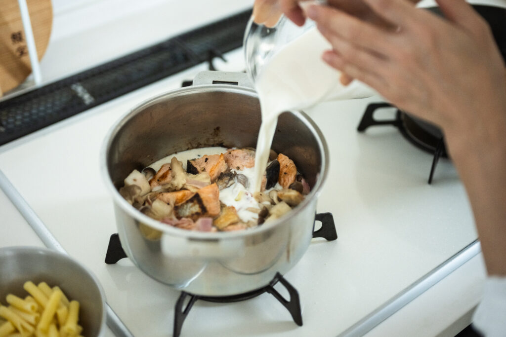 私がよく作る「米粉のベシャメルソース」を使って、鮭の他にも秋らしい具材を入れて、欲張りにマカロニも入れて、、、とその名の通り「秋の実りのごちそうグラタン」が出来上がりました。
