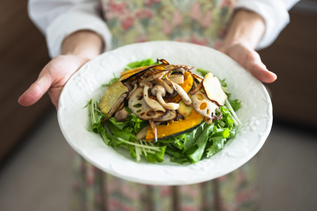 「根菜ときのこと柿のマリネサラダ」は、素揚げした根菜チップときのこのマリネを、生野菜の上にのせていただくサラダ。