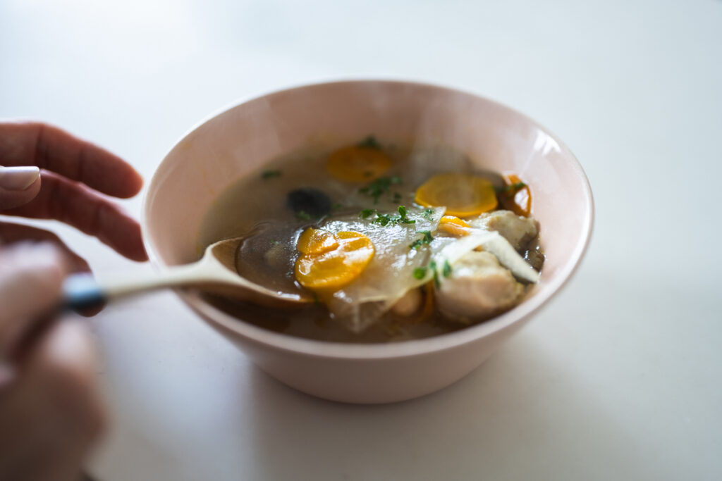 グラタンに合わせるスープとして、出来るだけあっさりめに仕上げたかったので、鶏のささみを使い、野菜を薄く切って、お皿の中でひらひらと秋の落ち葉が舞うようなイメージで仕上げてみました。