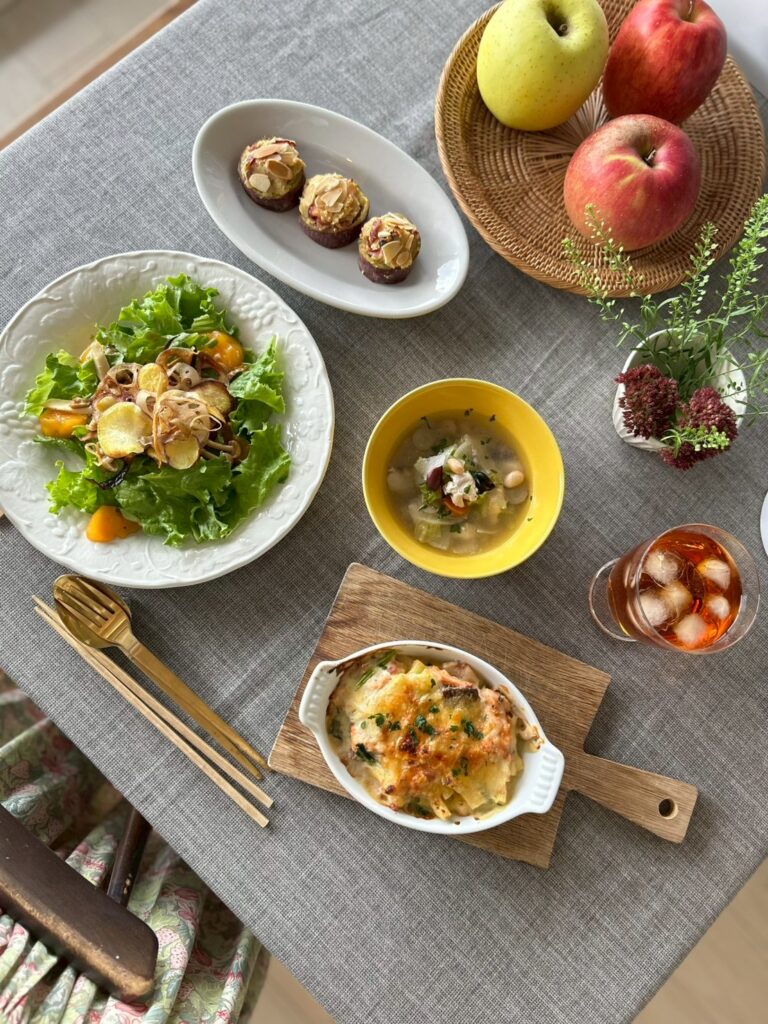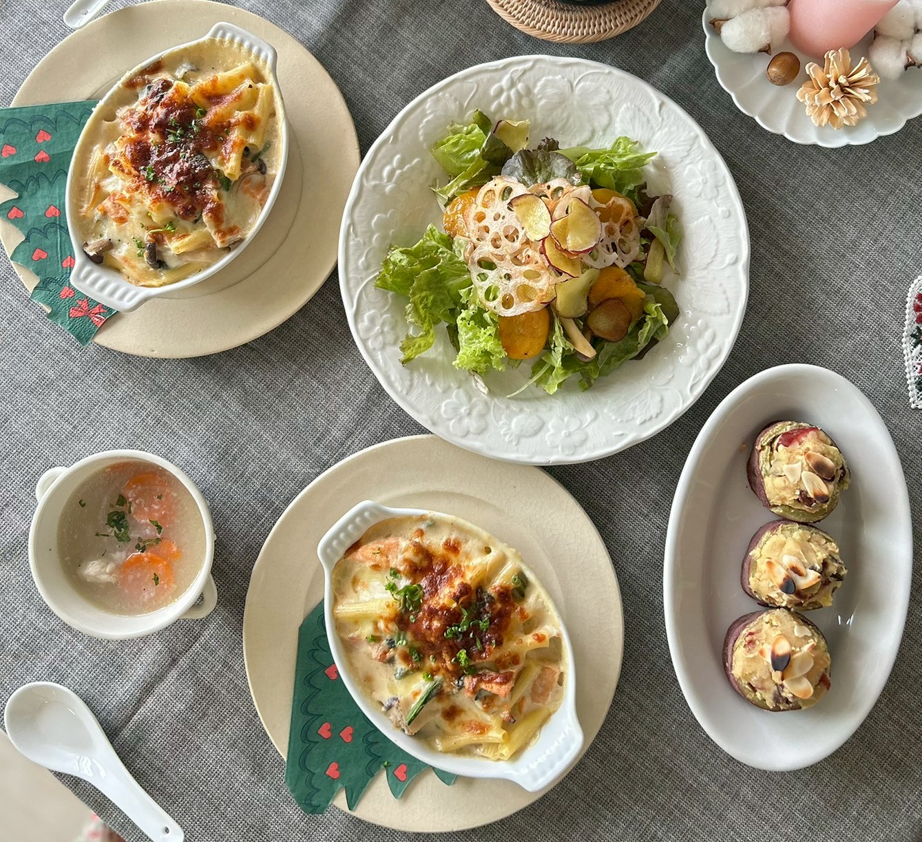 グラタン、スープ、サラダ、スイートポテト…どれも身近なお料理ですが、ビッケさんのレシピならではの工夫があって、いつもの料理がランクアップしたような気がしました。特に今回の料理は、これからのパーティーシーズンに使えそうなので、また人が集まる機会に作ってみたいです。 レンコンが大好きなので、たくさん食べることができて嬉しかったですし、すりおろしのレンコンをスープに入れたことがなかったので驚きでした!