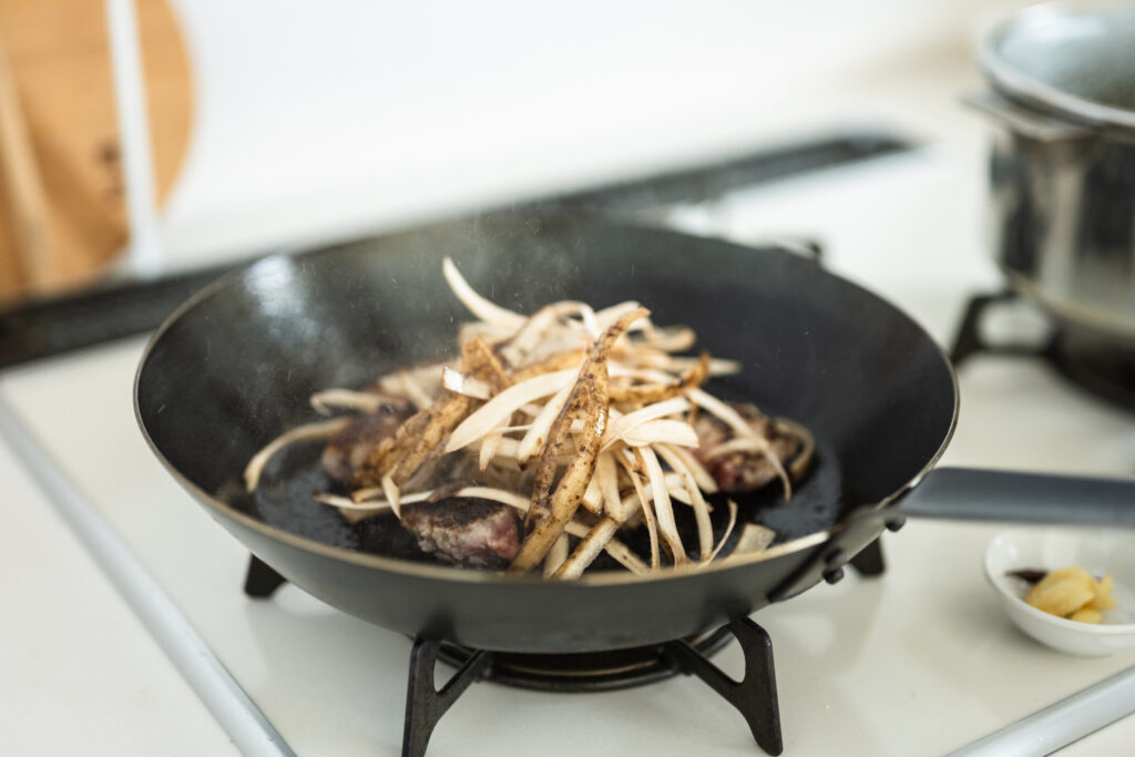 さらにそこに、ピーラーでひらひらにしたごぼうを合わせて炒め、最後は、しょうゆ麹を使って味を整え、ソースと麺を乳化させて仕上げます。