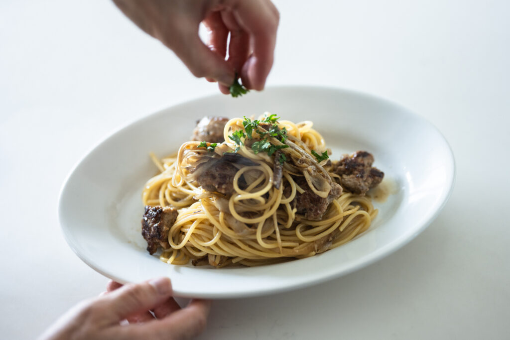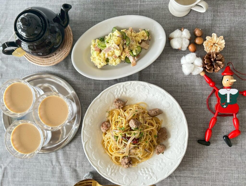 この季節になると、無性に食べたくなるんですよね。シンプルな和風パスタとは少し違って、サルシッチャ(豚ひき肉に調味料やハーブを加えて少し捏ねて作ります。)を使うので味に深みが出て、お店のパスタのような味わいになるんです。
