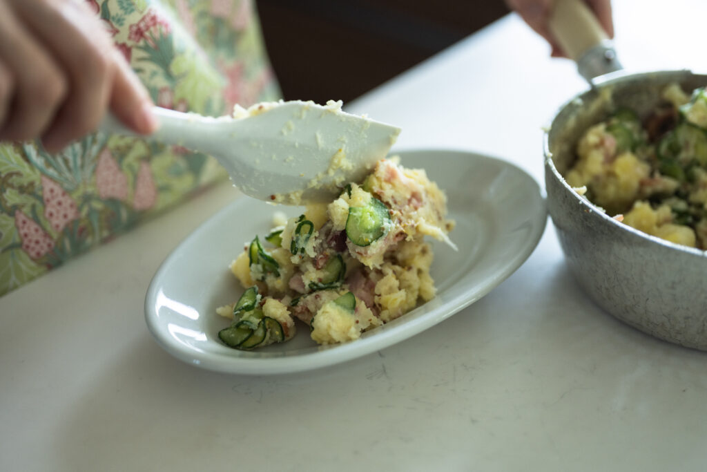 「ビッケのポテサラ2025秋ver.」は、いつもの定番「ビッケのポテサラ」に、秋と言えば!のさつまいもを加えて一緒に茹でて潰し、味付けの最後に粒マスタードでアクセントをつけました。